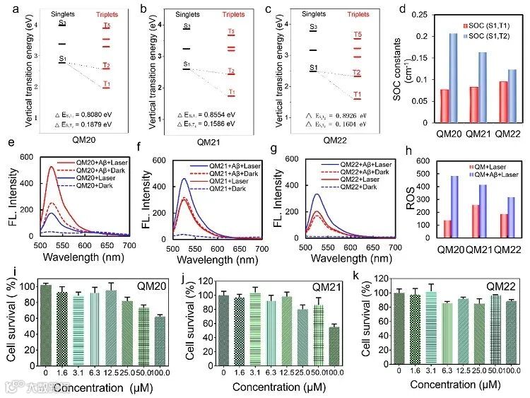 ) 和ωB97X-D/Def2svp理论水平上单重态和三重态之间的自旋-轨道耦合 (SOC) 值,以及S1和T2主跃迁轨道的分布。(e-g) 在不同条件下(QM + Aβ + Laser, QM + Aβ + Dark, QM + Laser, QM + Dark, laser = 532 nm) 下观测到的 QM20-QM22 下 SOSG 的荧光强度。(h) 在 QM20-QM22 中观察到的有/没有 Aβ 的 SOSG 的荧光强度。(i-k) 使用MTT测定SH-SY5Y细胞的细胞活力测定。图片来源: