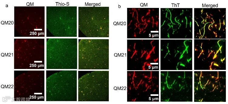 图2. (a) 在皮层区域的APP/PSI小鼠脑切片用Th-S(2 μM)和QM20-QM22 (2 μM)共标记的Aβ原纤维的共聚焦光学显微镜图像。比例尺:250 μm。(b) 与ThT和光敏剂QM20-QM22共标记的Aβ原纤维的荧光图像。比例尺:5 μm。图片来源: