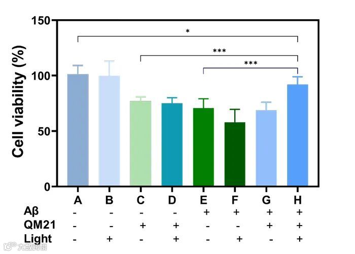 图7. QM21诱导的Aβ聚集体光氧合对PC12细胞活力的影响(QM21,5 μM,Aβ,20 μM,光照时间为1小时,孵育24小时,n = 6,平均±标准偏差,*p<0.1,**p<0.01,***p<0.001通过t-test)。图片来源: