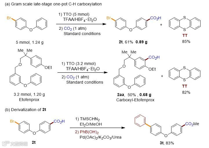 直接从药物分子或含有溴原子的复杂芳烃出发,该反应均能够以克级规模一锅法高效得到羧化产物,生成的噻蒽(TT)也能以良好的收率进行回收,展现了该方法的在羧酸合成及复杂分子后期羧基化修饰方面的应用潜力。