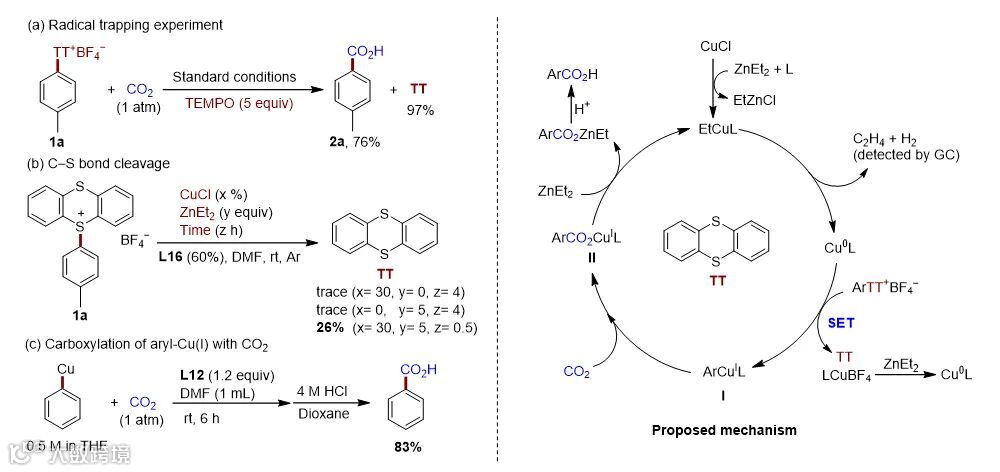 通过自由基捕获、C-S键断裂探索、芳基铜化合物的合成及直接羧化、气体检测等一系列机理实验,作者提出了由活性零价铜启动,经单电子转移得到一价芳基铜物种,继而进行C