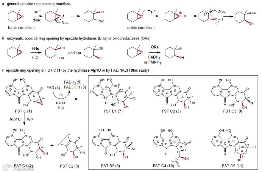 图1. 典型的环氧开环反应。(a) 酸碱条件下非酶的环氧开环反应;(b) 酶催化的水解或还原环氧开环反应;(c) Alp1U或FAD/NADH介导的FST C (