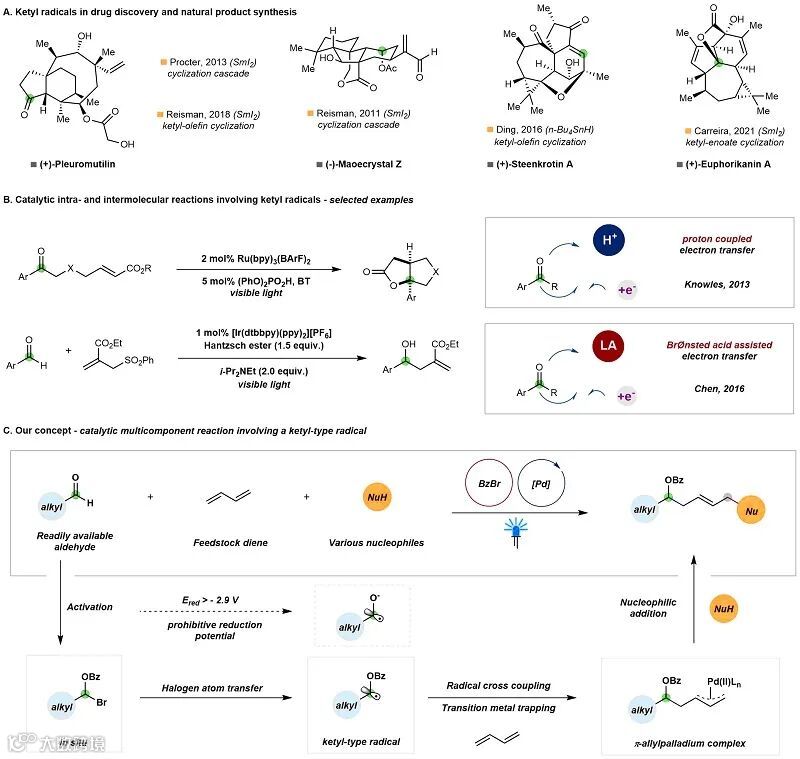 羰基类自由基是一类非常活泼的自由基中间体,由它引发的化学反应已经广泛应用于各类药物分子以及天然产物的合成中。传统自由基化学中,往往需要利用当量或者过量的强还原试剂来实现对醛的还原,从而构建相应的羰基自由基,进而促进相关反应的进行。近年来,可见光催化化学和电合成化学为这一领域提供了一些新的发展契机。例如,Knowles课题组利用质子耦合的电子转移策略实现了对醛的还原以及偶联反应;Yoon、Ngai、黄培强、余达刚、陈以昀等教授领导的课题组实现了Lewis酸促进的还原偶联以及环化反应。值得一提的是,Nagib教授课题组利用醛原位生成碘化物的方式实现了醛和炔类化合物的偶联反应。相较而言,设计羰基类自由基参与的多组份反应报道较少,主要原因是自由基多组份反应往往存在兼容性、选择性以及反应速率等方面的问题。
