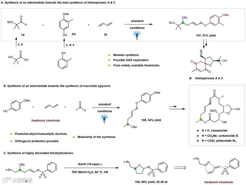 最后,作者利用该合成策略应用于天然产物关键合成片段的合成中去,该方法不仅缩短了合成步骤,而且原材料价格低廉易得。不仅如此,作者提供的这些方法有助于快速构建类似结构的分子片段,有助于后期药物筛选阶段结构和性能之间的关系研究。