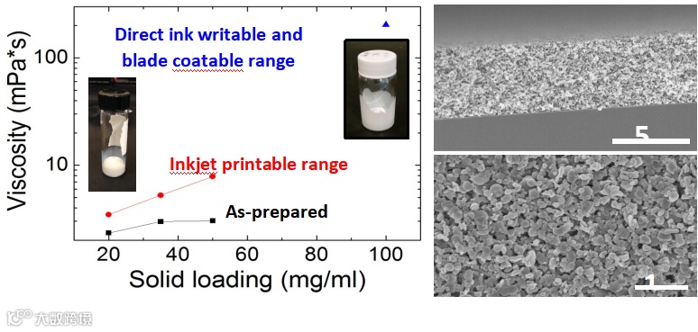 通过与 Mark Hersam 教授的技术平台的合作。我们开发、制造出具有可调粘度的剥离六方氮化硼墨水(简称hbn),可以用于不同的涂层技术,例如低粘度喷墨印刷、高粘度直接墨水书写或刮刀涂层。