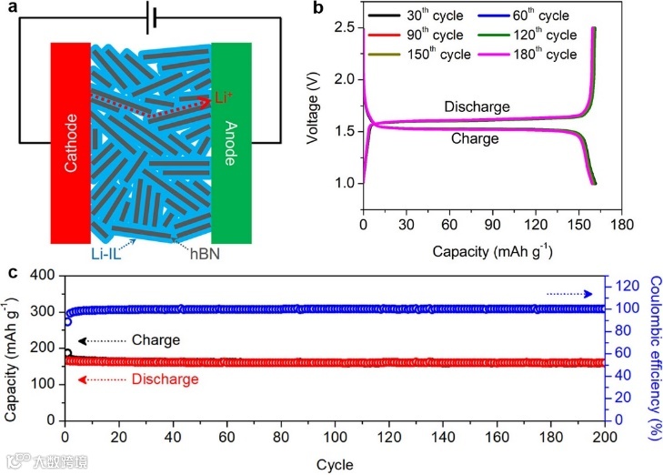由于这种较高机械性,用这种 hBN 离子凝胶电解质制成的锂离子电池在 0.1C 下 6 个月显示出高稳定性和可循环性。
