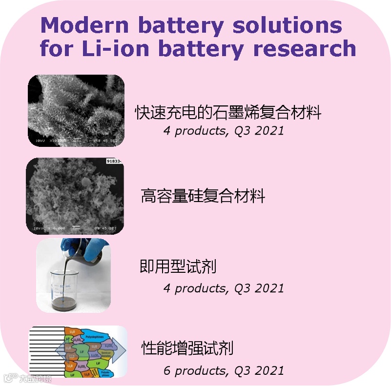 默克目前的研发工作主要致力于电池材料研究和应用市场两大领域。近期我们为我们的科研用户推出了以下适用于锂电池研发创新性产品:包括4款快速充放电的石墨烯复合材料、高容量硅复合材料、4款即用型试剂、6款性能增强试剂
