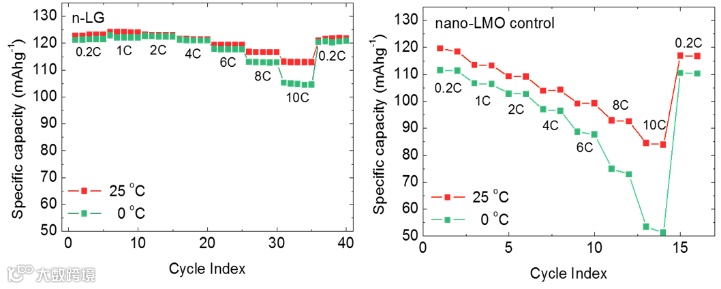 当少层石墨烯墨水与纳米尺寸的锂锰氧化物混合时,退火电极可以成功地抑制锰溶解到电解质中,并显着提高半电池和全电池配置中电池性能的稳定性/可循环性,可以参照下方图1。这主要是由于高质量的少层石墨烯和分解的乙基纤维素在复合电极内形成互连的 SP2 碳网络的协同效应。与纯纳米锂锰氧化物的对照相比,这种相互连接的导电通路还降低了电池阻抗,并使电池能够以更高的速率保持更高的容量,可以参照下方图2。此外,如下方图3,与使用纯纳米锰酸锂电极的对照相比,这种复合电极还大大改善了锂离子电池的低温性能。