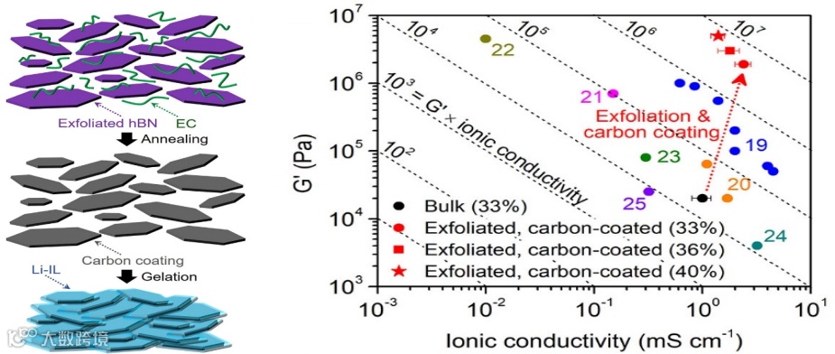 在这种情况下,乙基纤维素添加剂热分解成富含 SP3 的碳涂层(而不是石墨烯存在时的 SP2),它是绝缘的,并进一步增强了所得离子凝胶的机械性能。如下图所示,测得的这种离子醇凝胶的机械性能大约是用块状、非剥落氮化硼制成的离子醇凝胶的 100 倍。这种离子醇凝胶还提供了较高离子电导率。