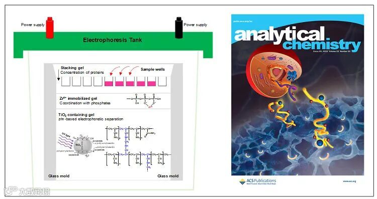 钟鸿英教授研究团队建立了一种用于分离磷酸化蛋白的新型光聚合串联凝胶电泳技术,这种技术在酸性条件下按照电荷-质量比(z/m)进行蛋白质分离。携带正电荷的质子化蛋白首先于低电压下在浓缩胶(stacking gel)被富集,升高电压后进入Zr4+固定化凝胶层(Zr4+ immobilized gel),蛋白质因携带的磷酸基团与Zr4+离子配位而改变泳动速度,最后在ATU凝胶(Triton X-100-acetic acid-urea gel)上进一步按照电荷-质量比进行分离。在酸性条件下,纳米TiO2用于在紫外光照下引发丙烯酰胺聚合反应。