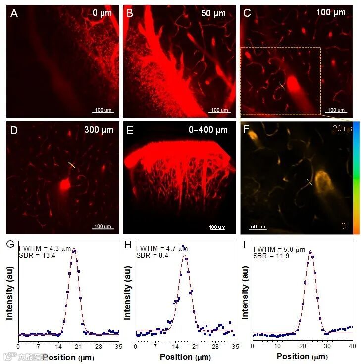 图2 (A-D)小鼠脑血管在不用深度下的双光子成像图片;(E)在0-400微米深度成像图片所构建的3D图;(F)脑血管在100微米深度的双光子激发荧光寿命成像图;(G-I)在(C、D和F)图中沿着血管所画直线上获得的荧光强度及所推演的血管直径和成像信噪比。