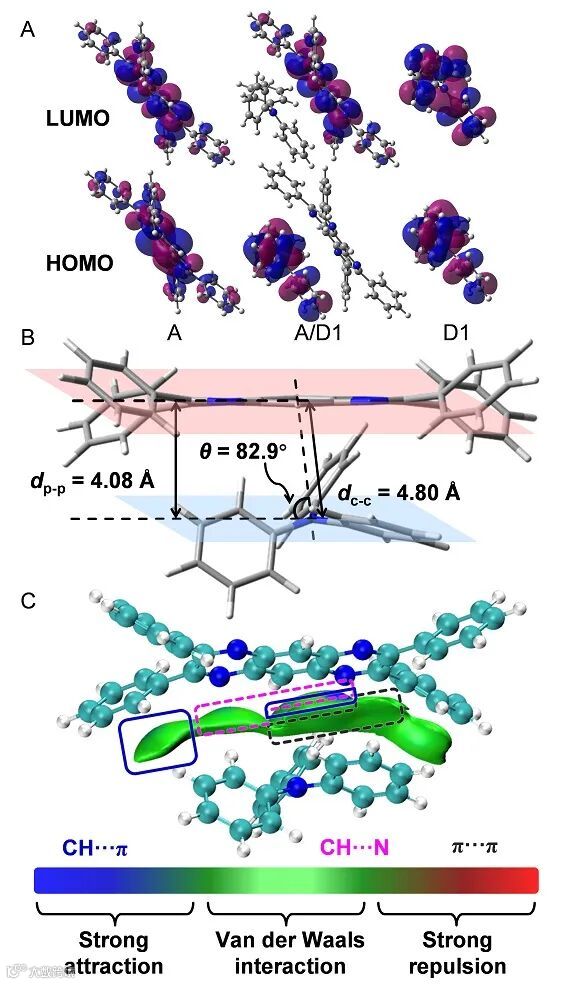 图1 (A)吡嗪类电子受体分子和三苯胺电子给体分子及其复合物的HOMO-LUMO分布;复合物中给受体分子间的(C)堆积和(D)相互作用。