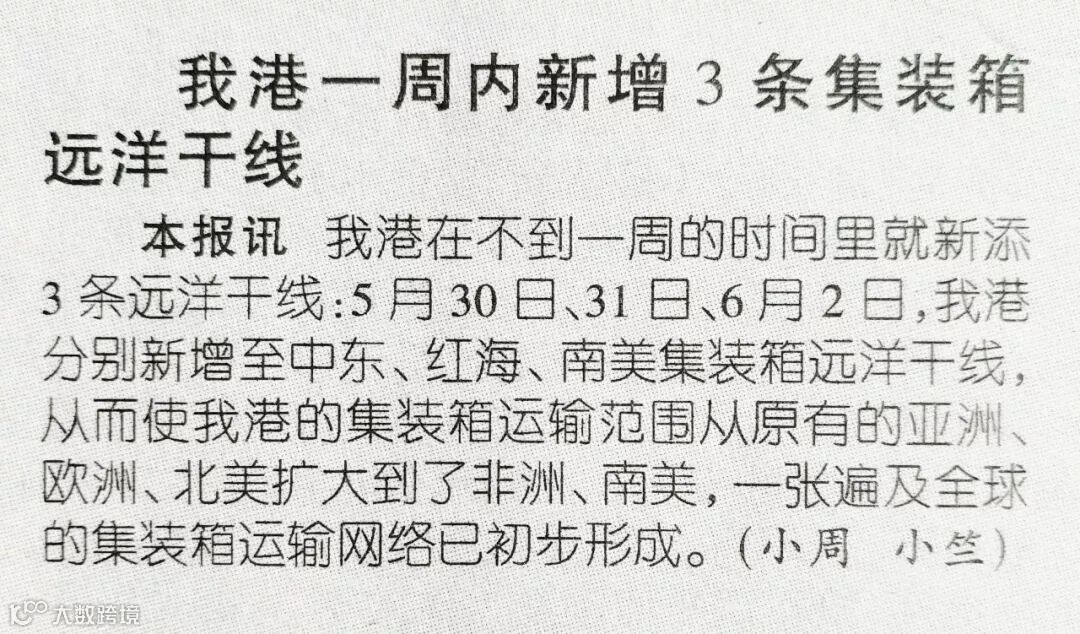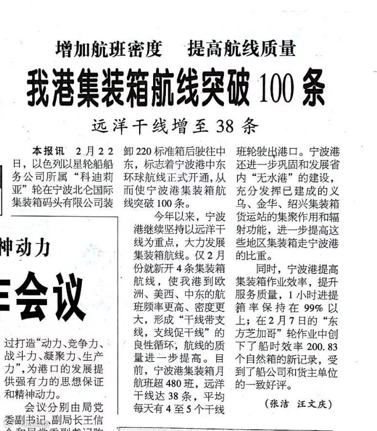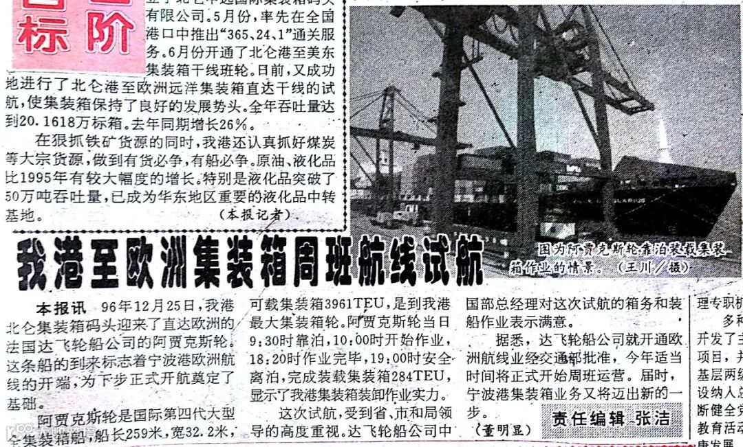 1996年12月25日,宁波港至欧洲集装箱周班航线试航。