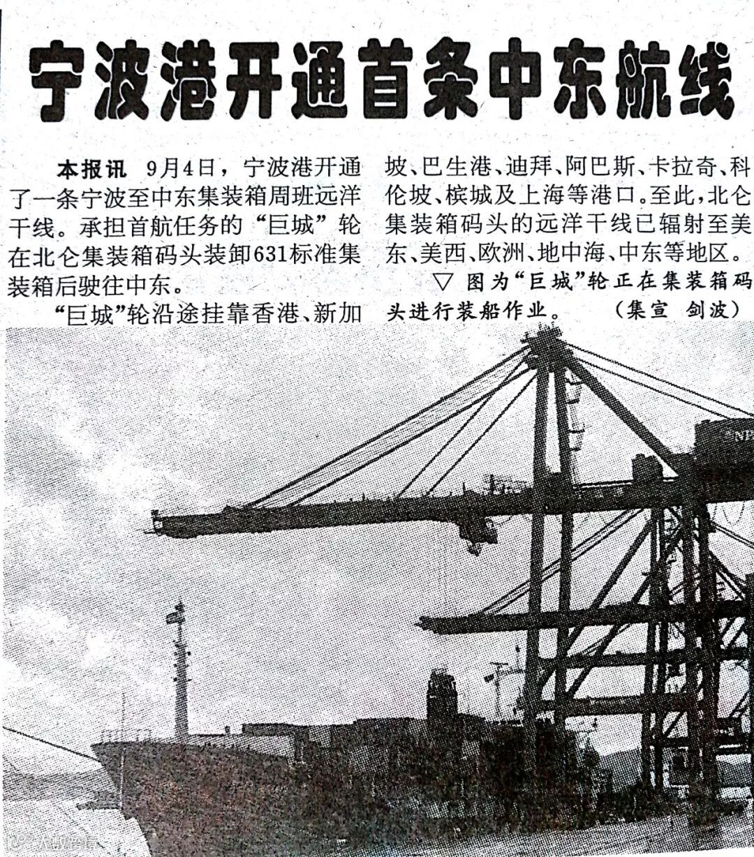 1999年9月4日,宁波港至中东集装箱周班远洋干线顺利开通,承担首航任务的是“巨城”轮,沿途挂靠香港、新加坡、迪拜等港口。