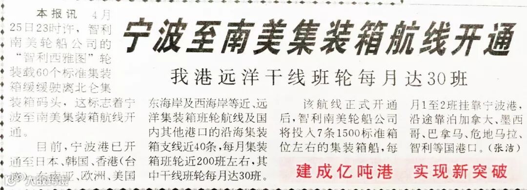 2000年4月25日,智利南美旗下的“智利西雅图”轮装载集装箱货物缓缓驶离北仑港区集装箱码头,标志着宁波港至南美集装箱航线开通。