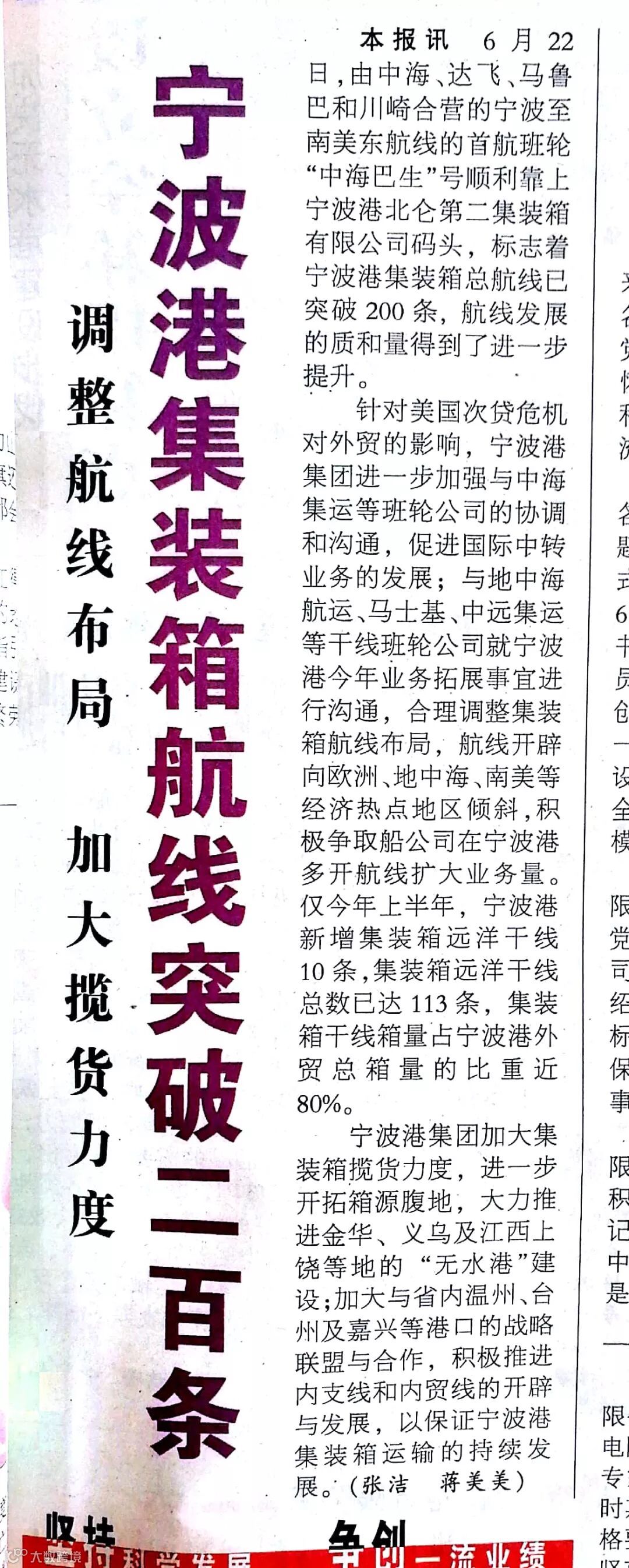 2008年6月22日,由中海、达飞、马鲁巴和川崎合营的宁波舟山港至南美东航线的首航班轮“中海巴生”轮顺利靠上北仑港区集装箱码头。至此,宁波舟山港集装箱航线数量突破200条。
