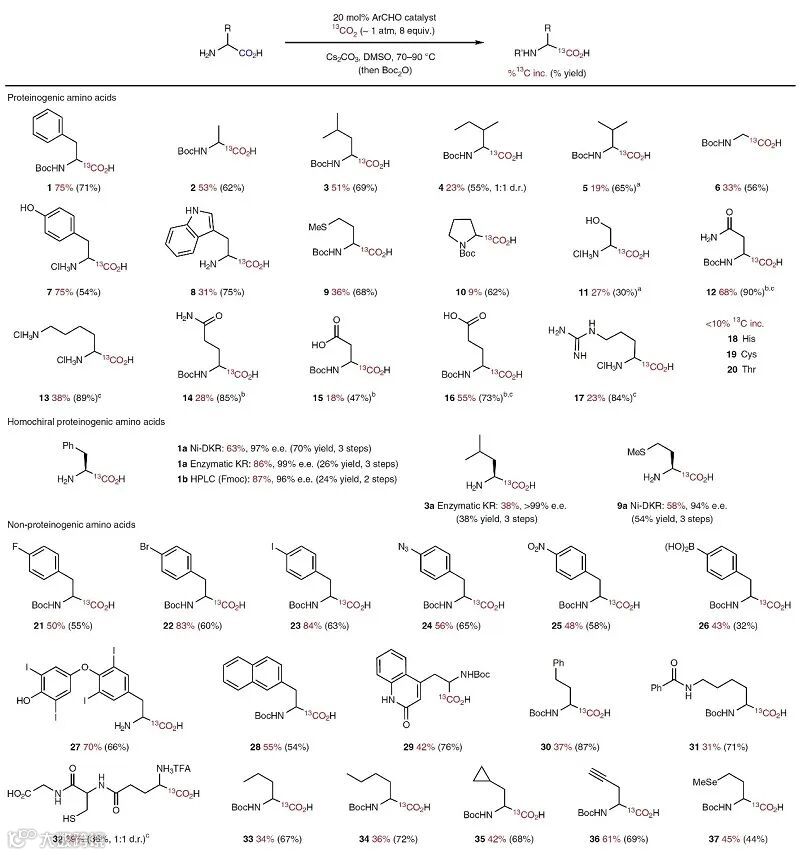 图4. 醛催化α-氨基酸与[11C] CO2的羧酸交换反应。图片来源:Nat. Chem.