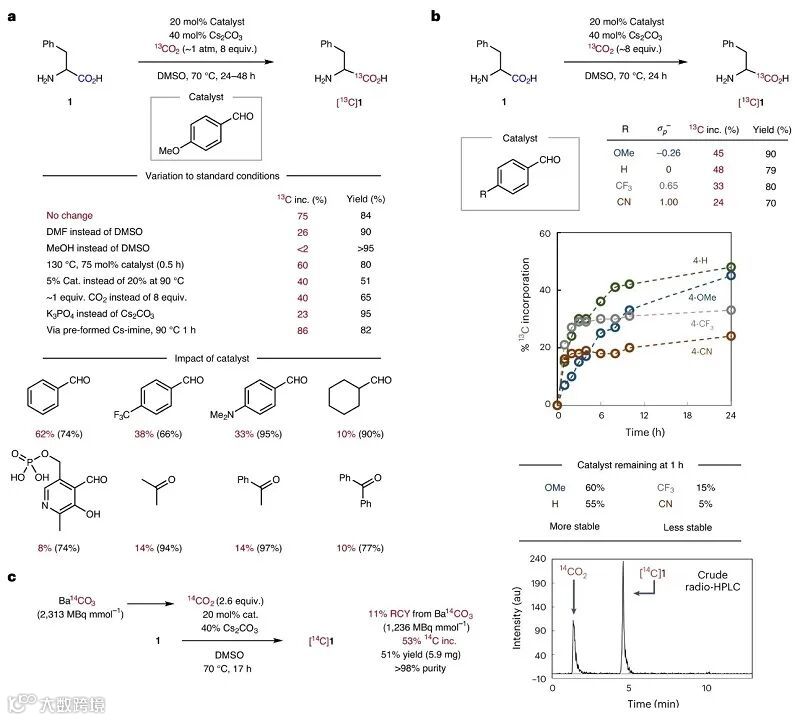 在外加[13C]CO2的体系中,作者以(±)-苯丙氨酸1为模板底物对反应条件进行优化(图2a),结果显示在4-茴香醛(20 mol%)为催化剂、Cs2CO3(40 mol%)为碱、[13C]CO2(~8 equiv.)、DMSO为溶剂的条件下于70℃进行反应,能以75%的13C掺入率和84%的收率得到目标产物(±)-[13C] 1。需要指出的是,4-茴香醛凭借其自身的亲电性成为最佳催化剂,若使用亲电性较强的芳醛催化剂会因竞争性捕获导致收率降低(图2b),而使用亲电性较弱的催化剂(如:磷酸吡哆醛、烷基醛和各种酮等)则导致同位素的掺入率较低。另一方面,对催化剂的亲电性进行深入研究后,发现4-茴香醛反应速率较慢但具有较长的使用寿命,而更具亲电性的4-CF3-苯甲醛或4-CN-苯甲醛初始速率较快但易分解,从而降低13C的掺入率。此外,该反应还可用于引入14C标记,即Ba[14C]CO3原位生成[14C]CO2并在最佳条件下进行反应,可以53%的14C掺入率和51%的收率制备(±)-[14C] 1(图2c)。