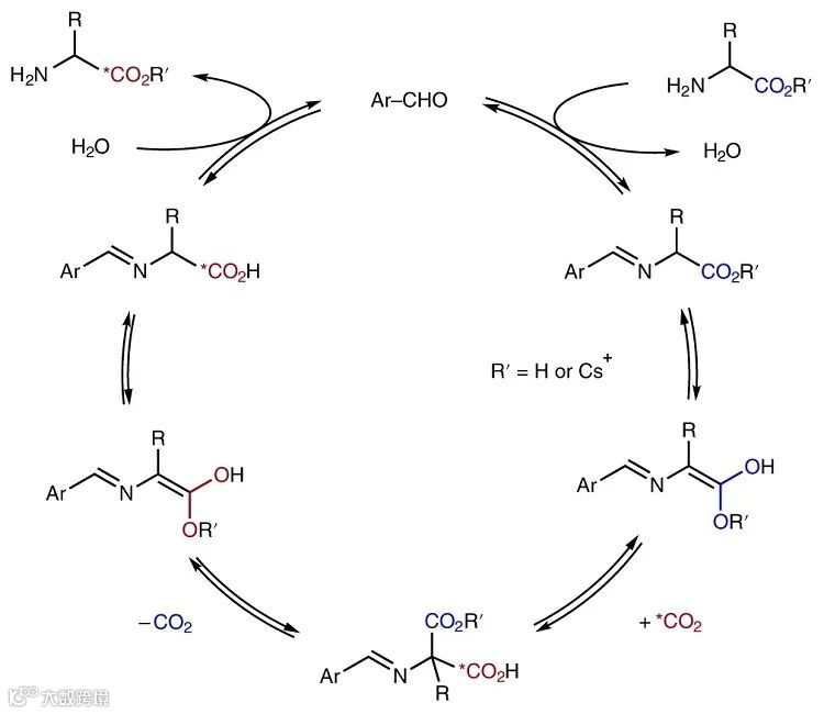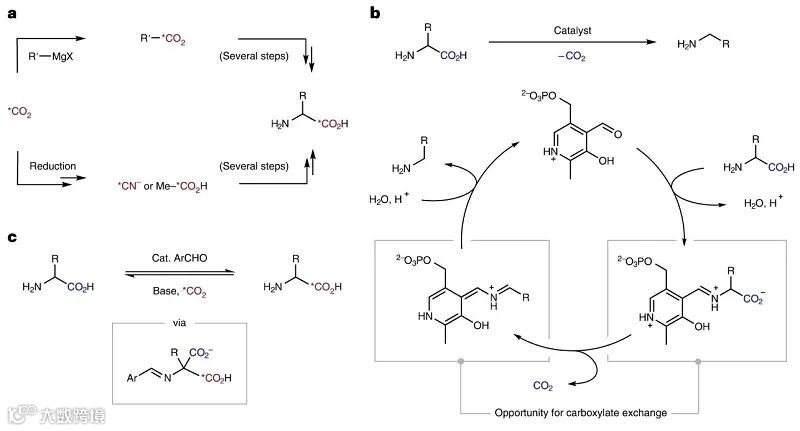 相比之下,CO2是所有同位素标记的碳试剂的主要来源。近年来,科学家利用动态同位素交换原理开发了几种对生物相关化合物进行碳标记的方法,包括:1) Pd催化的酰氯脱羰基化构建同位素标记的羧酸;2)镍催化活性酯的脱羧-羧化生成同位素13C-和14C标记的羧酸;3)热或光化学条件实现电性稳定羧酸的可逆脱羧-羧化来构建同位素碳标记的羧酸。如图1b所示,α-氨基酸在脱羧酶的催化下进行脱羧反应生成二氧化碳和相应的胺类化合物。在此基础上,加拿大阿尔伯塔大学Rylan J. Lundgren和渥太华大学Benjamin H. Rotstein等研究者利用芳醛催化剂和同位素标记*CO2实现了α-氨基酸的羧酸交换反应(图1c),构建了一系列11C、13C或14C同位素标记的α-氨基酸。机理研究表明该反应的关键中间体是亚胺-丙二酸中间体。相关成果于近日发表在Nature Chemistry 上。