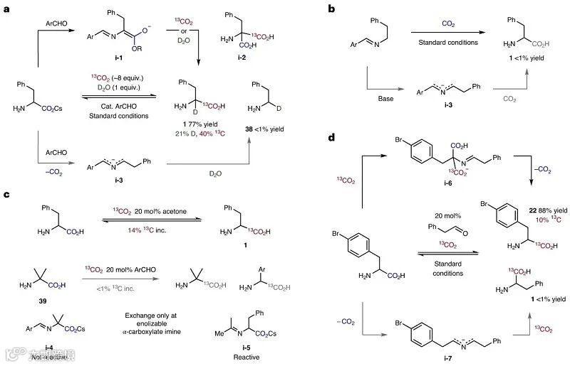 起初,作者认为羧酸盐交换机制可能是经亚氨基-烯醇或亚氨基-dienolate中间体(图5a,i-1→1)的羧化、再脱羧进行的,并非是最初脱羧形成的氮杂烯丙基阴离子中间体i-3捕获CO2的机制。为了探究反应机理,作者进行了一系列实验,结果表明:1)在标准条件下加入氘水的实验表明氮杂烯丙基阴离子不是反应过程中形成的中间体(图5a);2)对照实验表明α-氨基酸原位脱羧生成的胺不能通过羧化作用再次进行交换(图5b);3)丙酮催化羧酸盐交换反应时产物1的13C掺入率为14%,而非烯醇化的α-氨基酸(2-氨基异丁酸39)却无法实现交换反应,尽管后者能通过亚胺i-4的脱羧作用形成苄基稳定的氮杂烯丙基阴离子(图5c);4)4-溴苯丙氨酸和苯乙醛在标准条件下进行反应时获得的13C标记产物22,进一步支持了丙二酸中间体i-6的形成(图5d)。此外,在进行羧酸交换反应时,在不同醛负载量下没有观察到相应的芳基甘氨酸区域异构体,这进一步表明没有生成氮杂烯丙基中间体(如:i-3)。