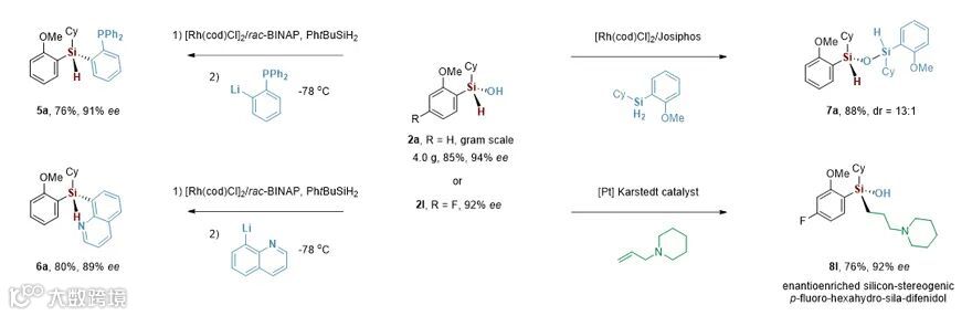 的合成(图6)。铑催化剂当量降低到0.05 mol%时,反应的对映选择性也能保持在90%以上。这些手性硅醇也能进一步进行转化和修饰,如