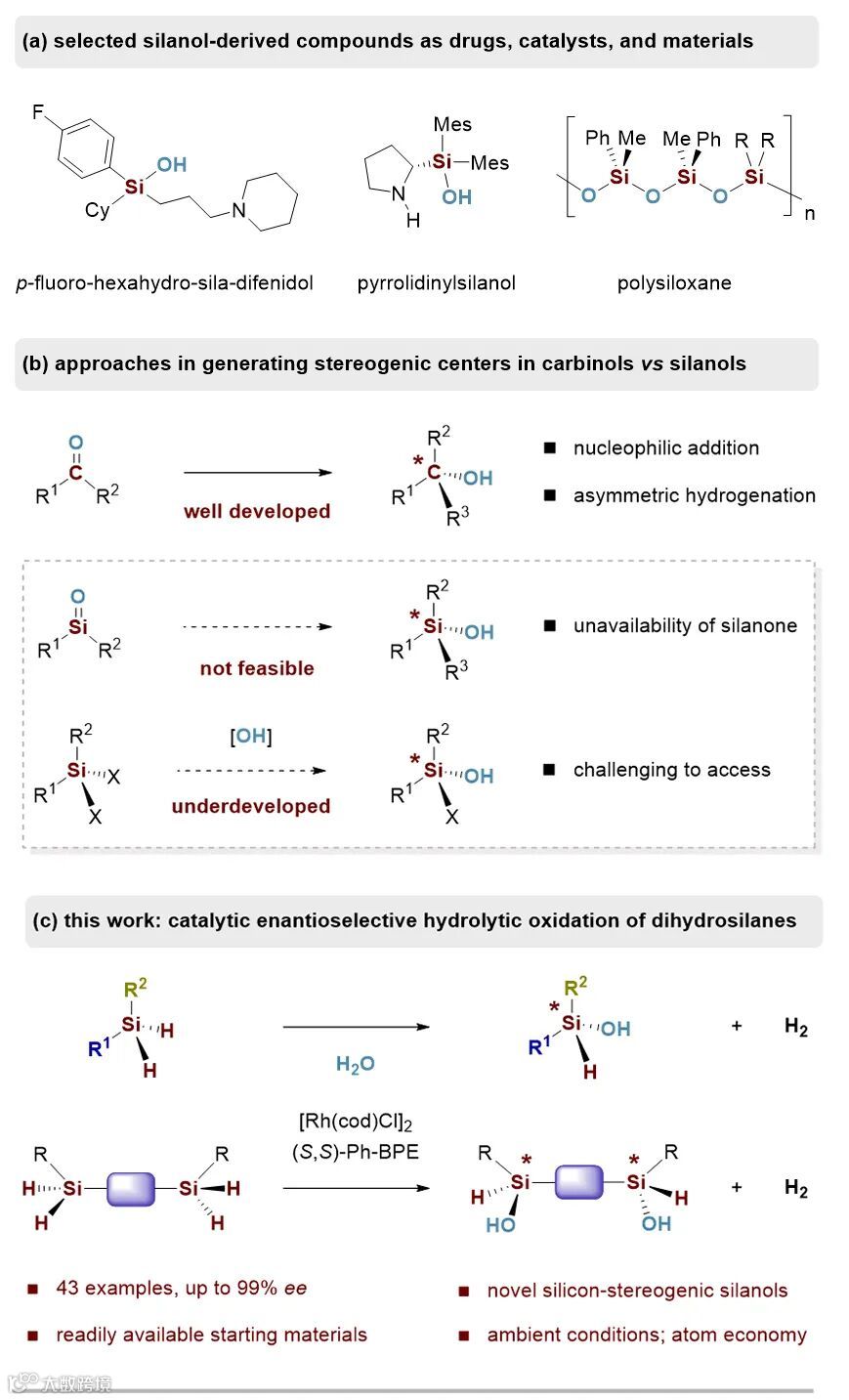 导读:南方科技大学何川课题组通过铑催化对二氢硅烷的不对称水氧化反应,首次实现了结构多样化的手性硅醇及双硅醇的高效不对称催化构建