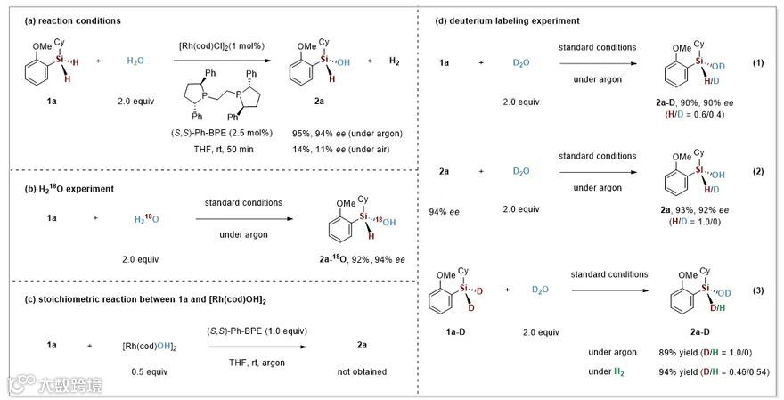 的标记实验证明了硅醇产物中的氧来源于水(图2b)。二氢硅烷