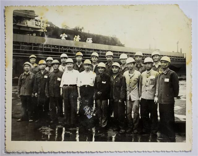 照片拍摄于1981年10月,一群头戴安全帽的码头工人站在码头上,在人群后面依稀可见港口的设备和一艘轮船,轮船上的“宝清海”三个字大部分可见。