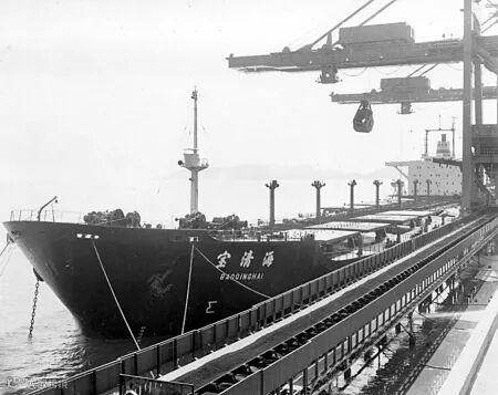 1981年10月5日,北仑矿石中转码头迎来了首艘10万吨级矿船——“宝清海”轮。