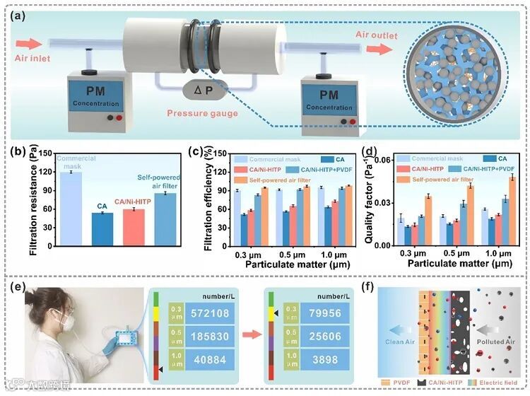 研究团队通过在CA上原位生长Ni-HITP制备导电CA/Ni-HITP复合材料,并与PVDF膜构建了R-TENG,设计了一种基于R-TENG的可穿戴自供电空气过滤器。同时,对自供电空气过滤器对亚微米颗粒物的过滤性能和过滤机理进行了分析。采用传统机械拦截和强化静电吸附相结合的方式,自供电空气过滤器对PM1.0和PM0.5的去除效率分别达到98.4%和97.3%,对PM0.3的去除效率高达95.0%。同时,过滤器的多孔结构使其在过滤时具有86 Pa的低压降。此外,该自供电空气过滤器在过滤亚微米颗粒物的同时,还可以根据频率和强度的不同实时监测佩戴者的呼吸状态。因此,基于R-TENG的自供电空气过滤器在人类身体健康、自供电医疗产品和大气污染物去除等方面具有更多的潜在应用。