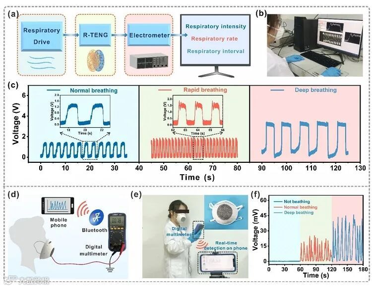 所制备的自供电空气过滤器在去除亚微米颗粒物时具有良好的去除效果。与CA、CA/Ni-HITP、CA/Ni-HITP+PVDF和普通商用口罩相比,自供电空气过滤器对亚微米颗粒物(PM0.3、PM0.5、PM1.0)的去除效率最高,对PM1.0、PM0.5和PM0.3的去除效率分别为98.4%、97.3%和95.0%,并且随着颗粒直径的增大,去除效率逐渐增大。该研究团队还进一步探讨该自供电空气过滤器在呼吸监测中的应用前景。自供电空气过滤器也可以与数字万用表连接,并通过无线的方式将数据传输到手机端,当测试者呼吸时,就可以在手机上实时检测到输出信号。因此,该自供电空气过滤器能够通过一些呼吸指标监测佩戴者的呼吸状态。