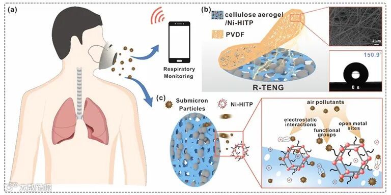 近日,广西大学轻工与食品工程学院聂双喜教授团队在Nano Energy 上报道了一种透气、高效过滤亚微米颗粒物和具有呼吸监测能力的自供电空气过滤器。首先,在纤维素气凝胶上原位合成导电金属有机骨架(Ni-HITP)制备纤维素气凝胶/Ni-HITP(CA/Ni-HITP)复合材料。然后,将CA/Ni-HITP与PVDF膜构建了呼吸驱动的摩擦纳米发电机(R-TENG),进一步设计了自供电空气过滤器。基于传统的物理过滤机制和静电吸附机制,自供电空气过滤器去除PM1.0、PM0.5和PM0.3的效率分别为98.4%、97.3%和95.0%,同时保持86 Pa较低的压降。所制备的自供电空气过滤器在过滤亚微米颗粒物的同时还可以根据频率和强度的不同实时监测佩戴者的呼吸状态。该自供电空气过滤器在人类健康、自供电设备和大气污染物去除等方面具有了更多的潜在应用。