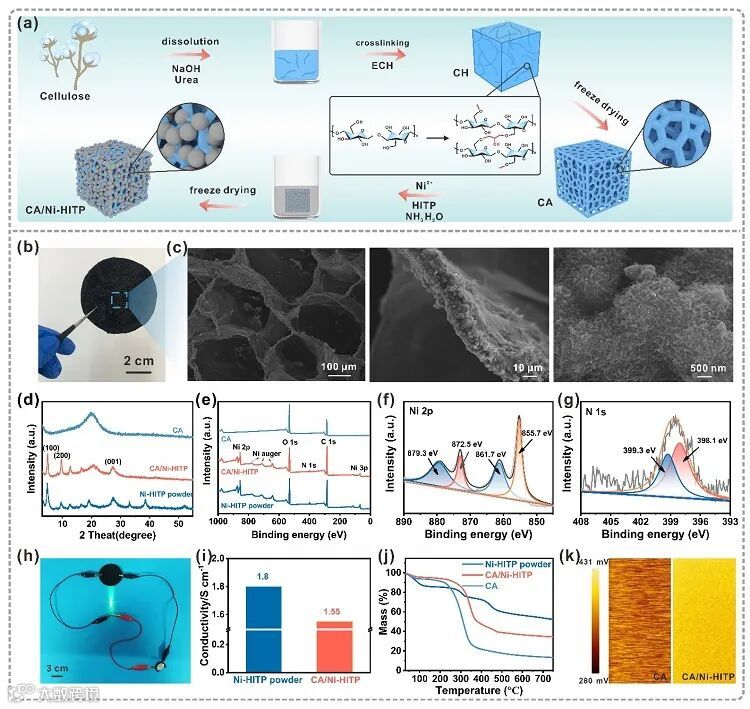 大多数植物如木材、竹子和棉花主要含有三种成分,即纤维素、木质素和半纤维素,其中,纤维素易于溶解,可用于CA的制备。因此,采用溶解、交联、再生的方法得到纤维素水凝胶,再通过简单的冷冻干燥技术得到三维CA骨架。随后在CA上原位合成了Ni-HITP,得到了具有良好导电性的CA/Ni-HITP复合材料。分别采用元素分析、X射线衍射仪、X射线光电子能谱仪和原子力显微镜等对CA/Ni-HITP复合材料的化学性质进行探究。