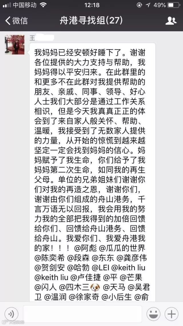王栋在寻回妈妈后,在“舟港寻找组”微信群里,向同事们表示衷心感谢。