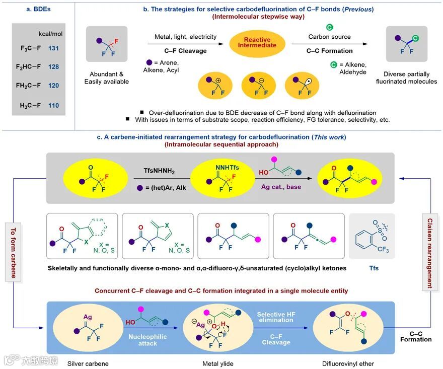 毕锡和教授课题组报道了一种通过卡宾引发的重排策略对氟烷基酮的C–F键进行脱氟碳化的方法,实现