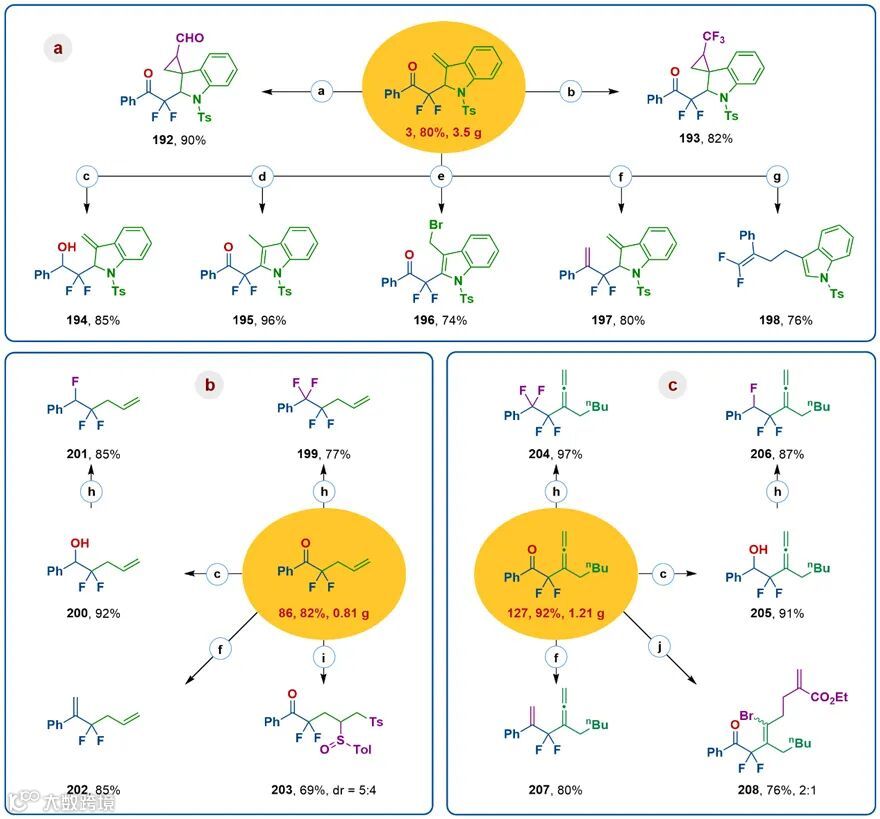 的克级规模合成,并进行了衍生化实验(图4)。经过环加成、还原、芳构化、氟化、Wittig反应以及自由基双官能化等转化,进一步获得高值有机分子,充分证明了该反应的实用性。