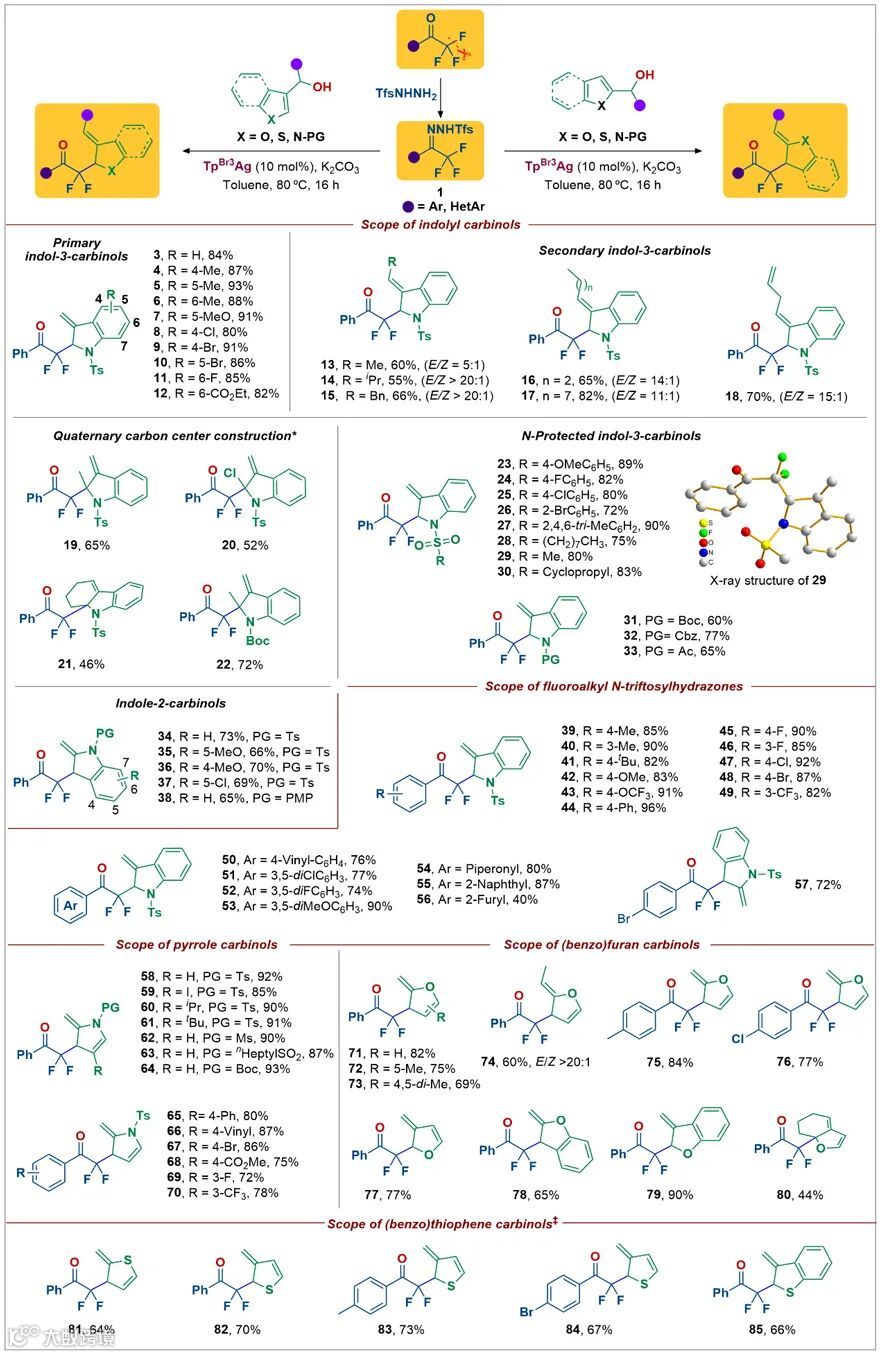 范围包括五元(苯并稠合)杂芳基甲醇、烯丙醇和炔丙醇,可获得骨架和功能多样的α-单氟和α,α-二氟-γ,δ-不饱和(环)烷基酮。该反应具有高选择性;对不同官能团的耐受性表现极好;可兼容天然产物的结构后修饰;可进行放大量实验,安全且有效。