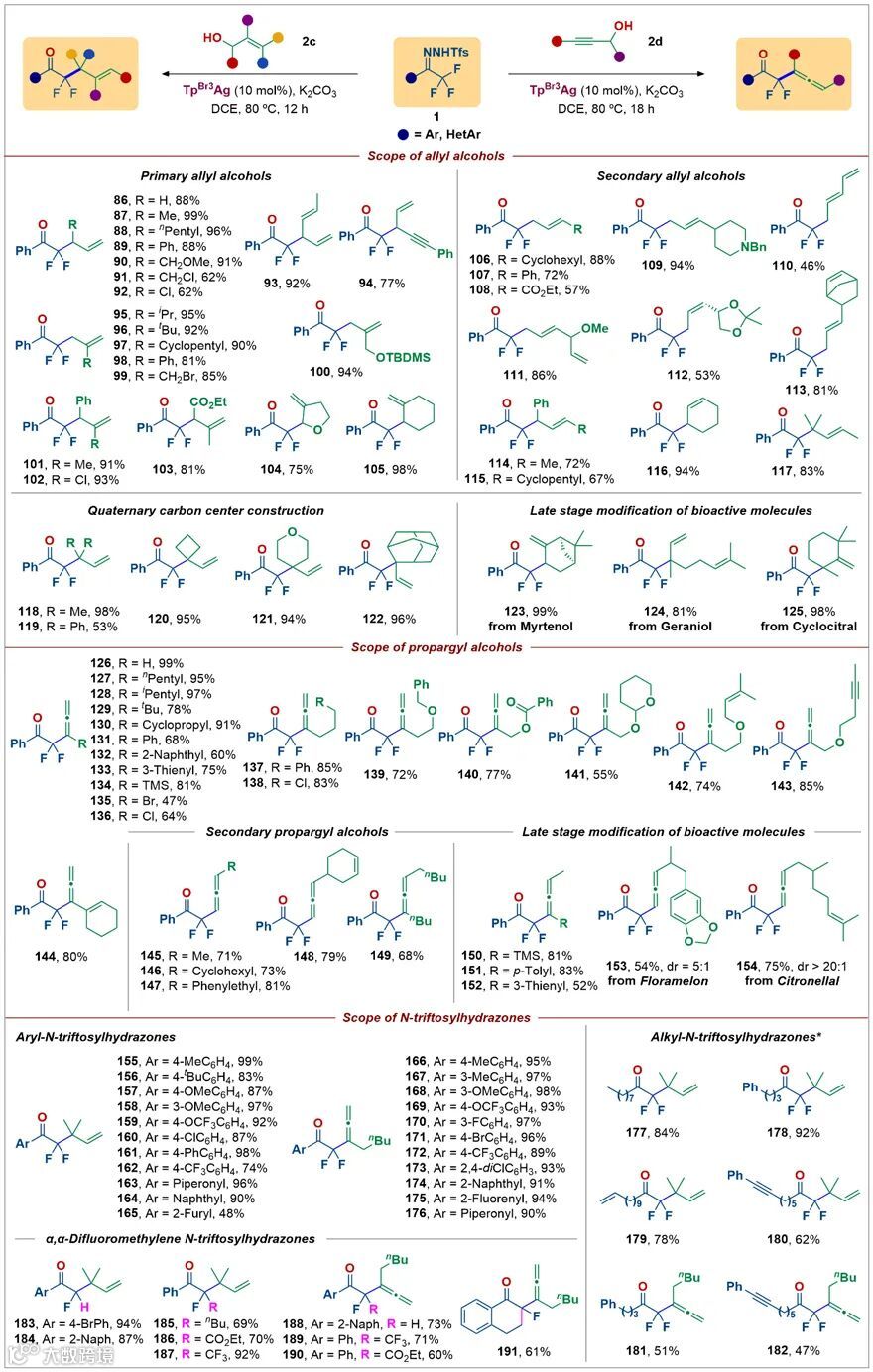 -三氟甲基腙范围在探究与杂芳环甲醇反应时已得到了证明,在与烯(炔)丙醇类化合物反应时同样适用。作者注意到使用