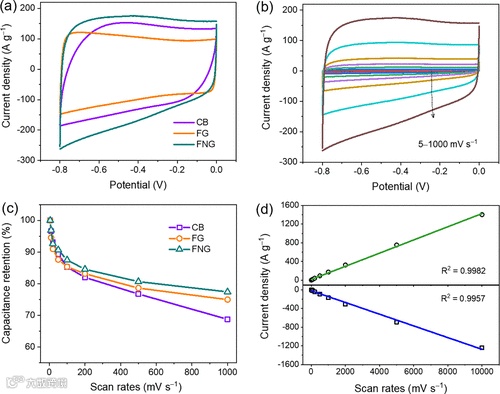 图4.闪蒸氮掺杂石墨烯的电化学性能。