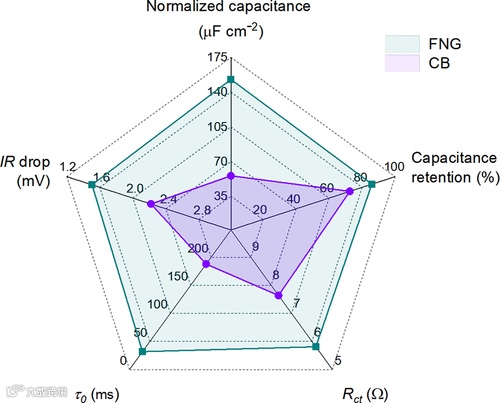 图6.闪蒸氮掺杂石墨烯与商业炭黑材料的储能性能对比雷达图。