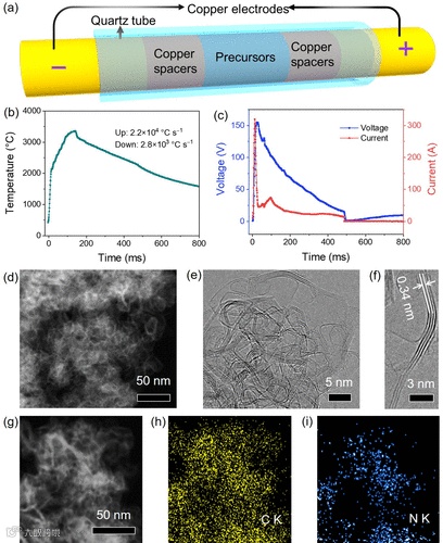 图1.闪蒸焦耳热法制备氮掺杂石墨烯示意图及产物形貌表征