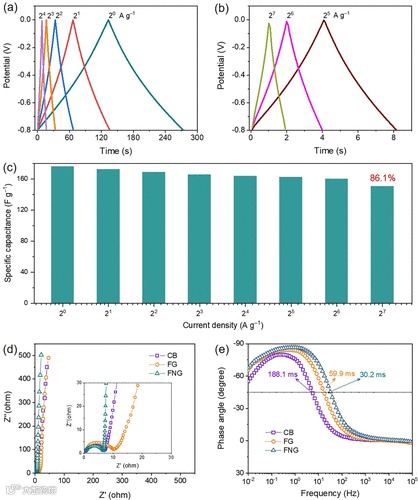 图5.闪蒸氮掺杂石墨烯的倍率性能和电极动力学过程分析。