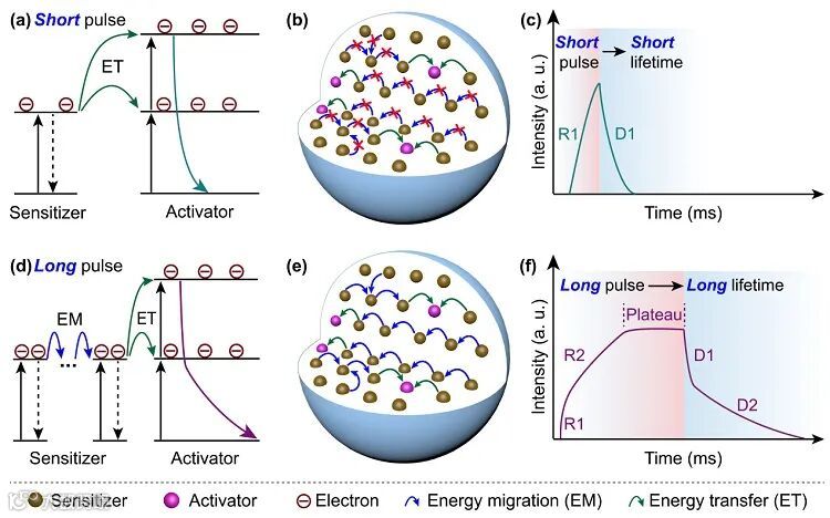 图1. 上转换纳米颗粒在短(a, b, c)、长(d, e, f)脉宽激发下的能量传输机理及时域响应曲线。图片来源:Angew. Chem. Int. Ed.