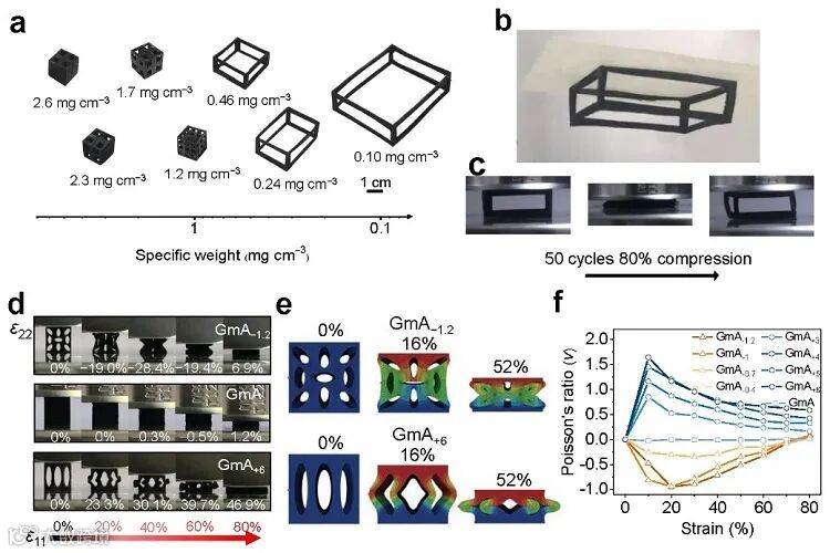图3.(a)激光雕刻的GmA不同中空结构与比重,(b)通过静电力吸附在打印纸上的超轻GmA,(c)超轻GmA经过50次80%应变的压缩循环照片,(d)不同泊松比的GmA在压缩过程中的快照,(e)不同泊松比的GmA的有限元分析图,(f)不同泊松比的GmA在压缩过程中的应变与泊松比关系图。