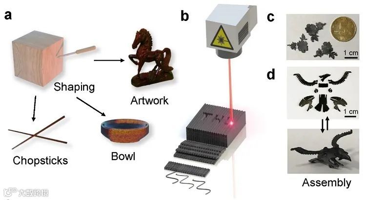 图1.(a)传统木雕生产的生活用品以及艺术品,(b)快速激光加工成型石墨烯气凝胶过程,(c)激光雕刻石墨烯气凝胶牡丹花样品,(d)激光雕刻石墨烯气凝胶可重复组装的鹰样品。