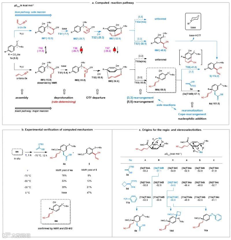 (图1b)。该[5,5]-重排不仅涉及四价硫氧化性的释放,还涉及重排前体中烯酮亚胺结构的张力释放。双重驱动力促使重排过程在极低