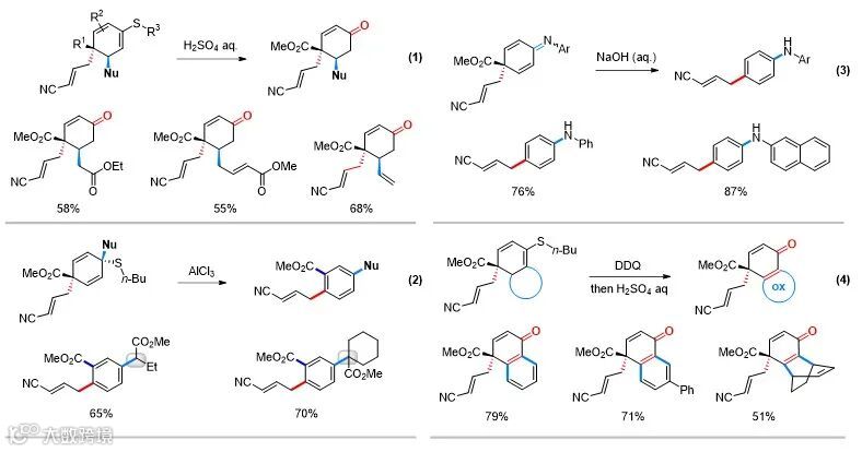 下迅速完成(−100 °C, < 1 s),这一反应特点,为发展去芳香化反应创造了有利条件。研究表明,通过该[5,5]-重排,可构建出不稳定的去芳香化硫鎓盐中间体。该中间体可与不同种类的亲核试剂发生1,2-或者1,4-或者环加成反应,制备一系列多官能团化的去芳香化环己二烯衍生物(图2)。其中,简单的烯醇硅基、富电子芳烃、有机锌试剂、醇、硫醇,给出1,4-加成产物(图2A)。α-烷基取代的烯醇硅醚或芳胺,易于进行1,2-加成(图2B,2C)。其中,芳基伯胺可给出脱硫的1,2-加成产物(图2C)。此外,共轭二烯以及偶极子可与去芳香化硫鎓盐中间体发生环加成反应,给出去芳香化的并环产物(图2D)。这些去芳香化产物经简单处理,可脱硫制备多取代环己烯酮或者芳烃衍生物(图3)。
