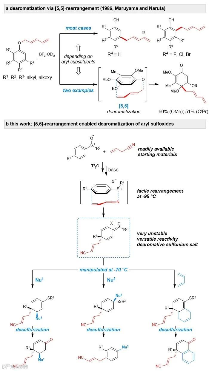 通过σ重排实现芳烃去芳香化是一种独特的去芳香化模式。现有文献报道的重排去芳香化主要依赖于[2,3]-或[3,3]-重排过程。相较而言,通过[5,5]-重排实现去芳香化的过程鲜有报道。仅有的例子来自于,1986年Maruyama和Naruta报道的Claisen型[5,5]-重排去芳香化 (