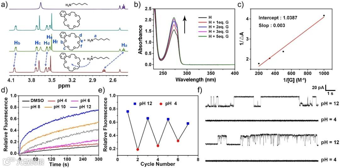 此外,通过在聚合物中引入对酸敏感的烷基胺侧链,还得到了pH门控型聚合物通道P3(图3)。众所周知,18-冠醚-6与质子化的氨基有较强的结合能力,而与去质子化氨基的结合能力较弱。因此,在酸性条件下(pH = 4),烷基胺基团处于质子化状态,能够与冠醚基团形成主−客体复合物,从而实现对离子通道关闭。在碱性条件下(pH = 12),烷基胺基团发生去质子化并从冠醚基团中解离出来,使得离子通道的重新开启。通过调节溶液pH的方式,改变18-冠醚-6与−NH2/−NH3+基团之间的复合与解复合,实现了对该柔性聚合物通道开−关的智能调控。