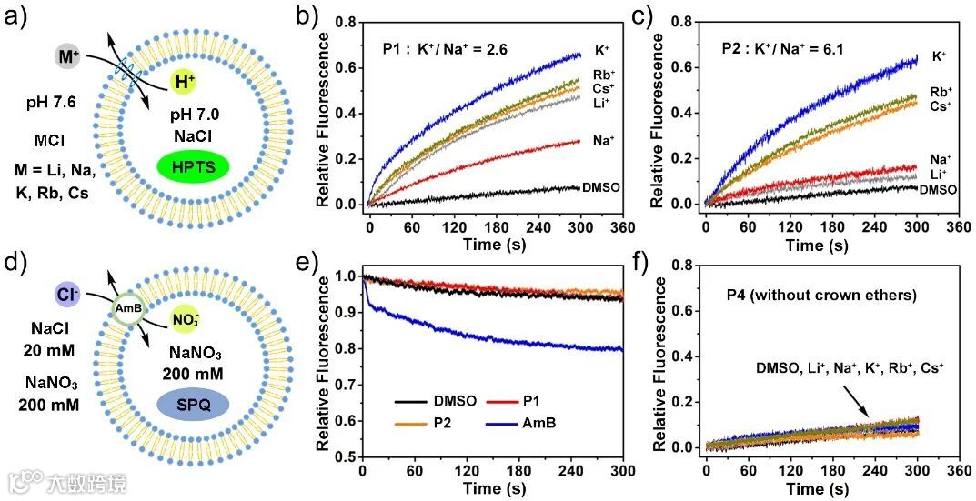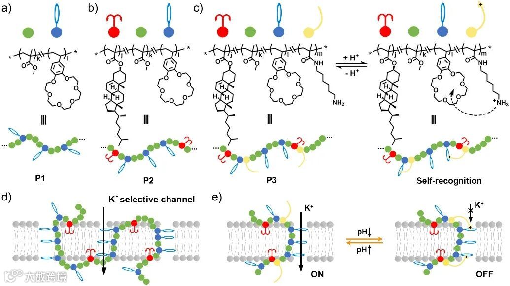 近期,杭州师范大学刘俊秋教授团队采用简单的“一锅法”聚合反应,制备了一系列侧链含有苯并18-冠醚-6基团的柔性聚合物并对其离子跨膜传输性质进行了详细研究(图1)。研究发现,在一定的单体比例条件下,柔性聚合物上的冠醚基团可以对钾离子进行选择性跨膜传输。由于胆固醇具有十分优异的嵌膜能力,因此,当在聚合物当中引入少量胆固醇作为“锚定”基团,可以使聚合物的嵌膜稳定性大大增加,并且通道的K+/Na+传输的选择性也得到了明显增强(图2)。平面脂双层单通道电流实验表明,不含胆固醇基团的聚合物P1在磷脂膜上并没有形成稳定孔道结构,而是以载体形式进行离子跨膜传递。而含有胆固醇作为“锚定”基团的聚合物P2在可以明显观测到平稳的方波型电流信号,因此可以判断苯并18-冠醚-6基团能够在P2上排列形成规则纳米孔并进行离子传输。